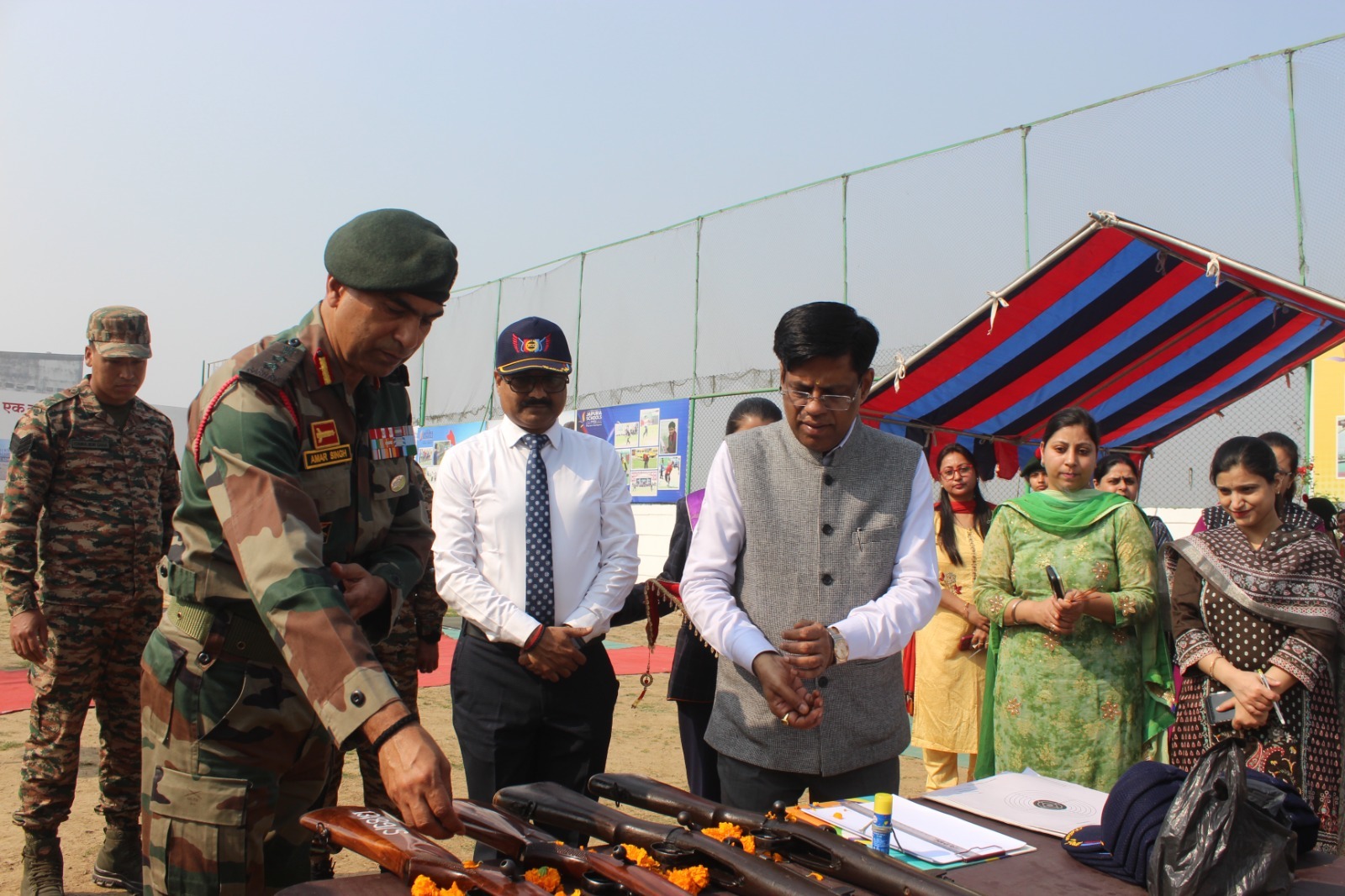 कार्यक्रम का शुभारंभ – कार्यक्रम मुख्य अतिथि के स्वागत से शुरू हुआ। कैंपस स्टोर के पास अतिथियों का औपचारिक स्वागत किया गया। एनसीसी कैडेट्स ने मार्च पास्ट के जरिए मुख्य अतिथि को शूटिंग रेंज तक ले जाया, जहां अनुशासन का शानदार प्रदर्शन हुआ।
