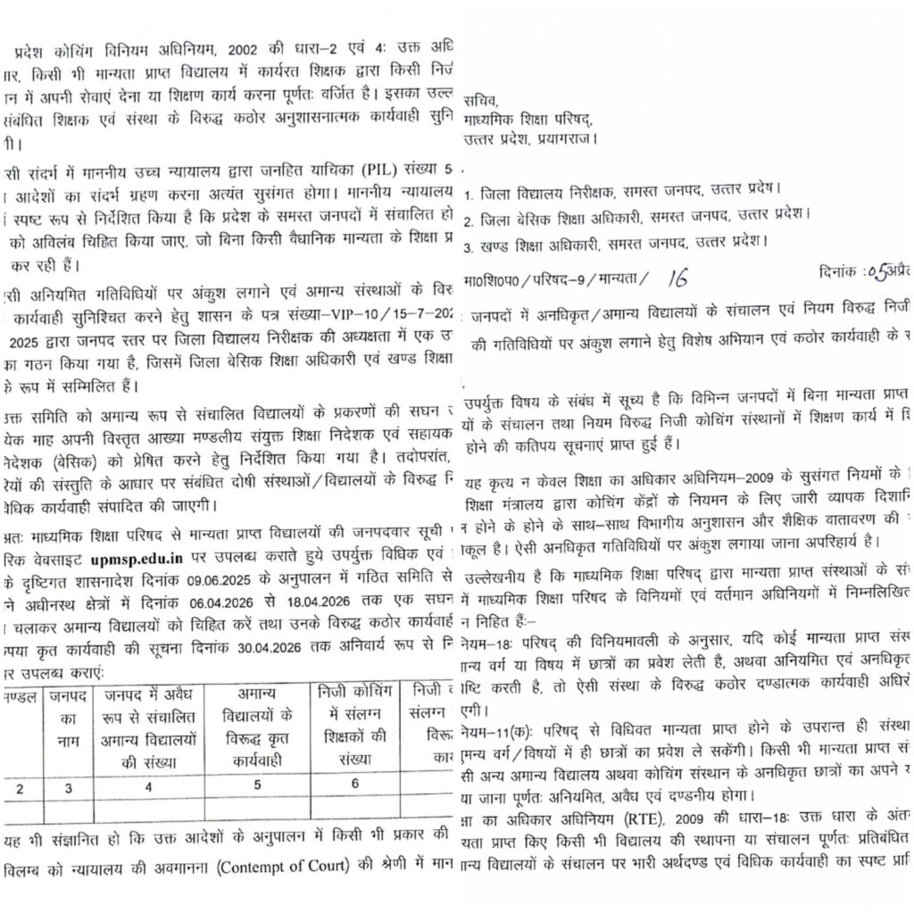 यह आदेश माध्यमिक शिक्षा परिषद, उत्तर प्रदेश, प्रयागराज के सचिव द्वारा जारी किया गया है, जिसमें स्पष्ट निर्देश दिए गए हैं कि अवैध शैक्षणिक गतिविधियों को हर हाल में रोका जाए और दोषियों पर सख्त कार्रवाई की जाए।