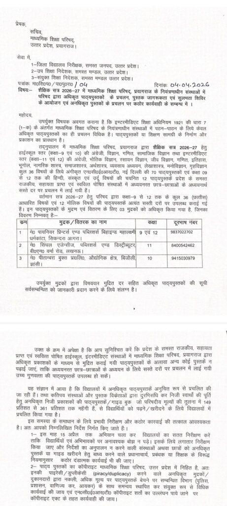 प्रयागराज/उ॰प्र॰ :: प्रयागराज से जारी एक महत्वपूर्ण आदेश में माध्यमिक शिक्षा परिषद, उत्तर प्रदेश ने शैक्षणिक सत्र 2026–27 के लिए स्कूलों में केवल अधिकृत (NCERT/UPMSP) पाठ्यपुस्तकों के उपयोग को अनिवार्य कर दिया है। परिषद ने साफ निर्देश दिए हैं कि किसी भी विद्यालय में अनधिकृत किताबें, गाइड या महंगी निजी प्रकाशनों की पुस्तकें नहीं चलेंगी।